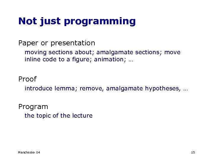 Not just programming Paper or presentation moving sections about; amalgamate sections; move inline code to a figure; animation; … Proof introduce lemma; remove, amalgamate hypotheses, … Program the topic of the lecture Manchester 04 15