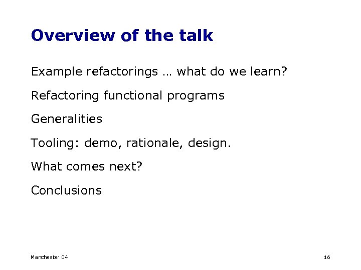 Overview of the talk Example refactorings … what do we learn? Refactoring functional programs Generalities Tooling: demo, rationale, design. What comes next? Conclusions Manchester 04 16