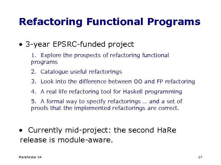 Refactoring Functional Programs • 3 -year EPSRC-funded project 1. Explore the prospects of refactoring functional programs 2. Catalogue useful refactorings 3. Look into the difference between OO and FP refactoring 4. A real life refactoring tool for Haskell programming 5. A formal way to specify refactorings … and a set of proofs that the implemented refactorings are correct. • Currently mid-project: the second Ha. Re release is module-aware. Manchester 04 17