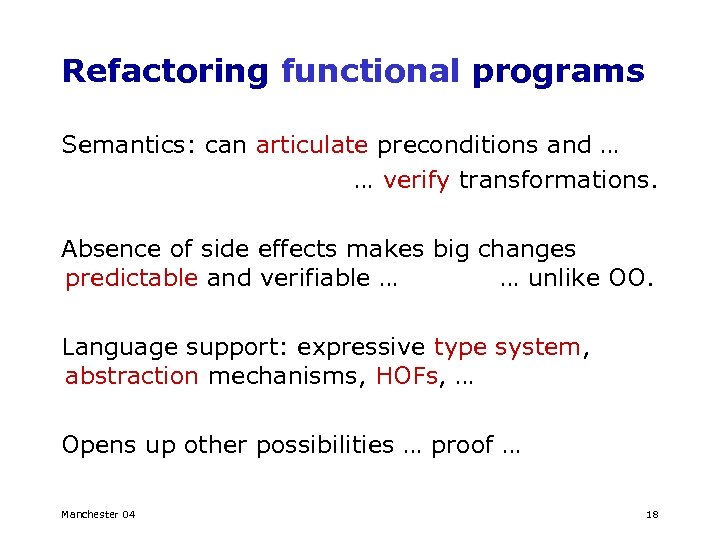 Refactoring functional programs Semantics: can articulate preconditions and … … verify transformations. Absence of side effects makes big changes predictable and verifiable … … unlike OO. Language support: expressive type system, abstraction mechanisms, HOFs, … Opens up other possibilities … proof … Manchester 04 18