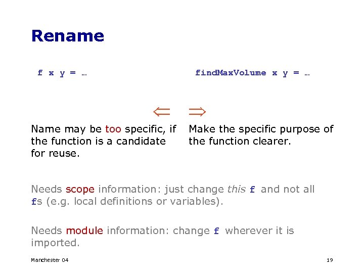 Rename f x y = … find. Max. Volume x y = … Name may be too specific, if the function is a candidate for reuse. Make the specific purpose of the function clearer. Needs scope information: just change this f and not all fs (e. g. local definitions or variables). Needs module information: change f wherever it is imported. Manchester 04 19