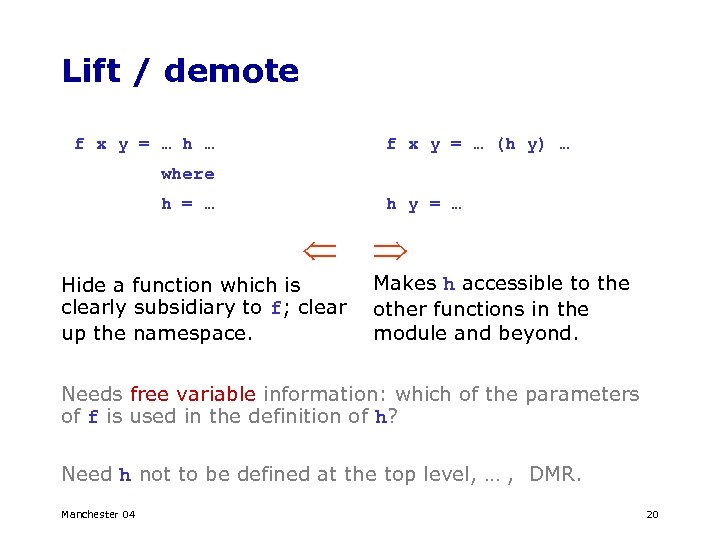 Lift / demote f x y = … h … f x y = … (h y) … where h = … h y = … Hide a function which is clearly subsidiary to f; clear up the namespace. Makes h accessible to the other functions in the module and beyond. Needs free variable information: which of the parameters of f is used in the definition of h? Need h not to be defined at the top level, … , DMR. Manchester 04 20