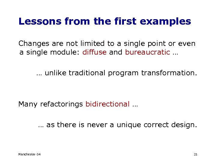 Lessons from the first examples Changes are not limited to a single point or even a single module: diffuse and bureaucratic … … unlike traditional program transformation. Many refactorings bidirectional … … as there is never a unique correct design. Manchester 04 21