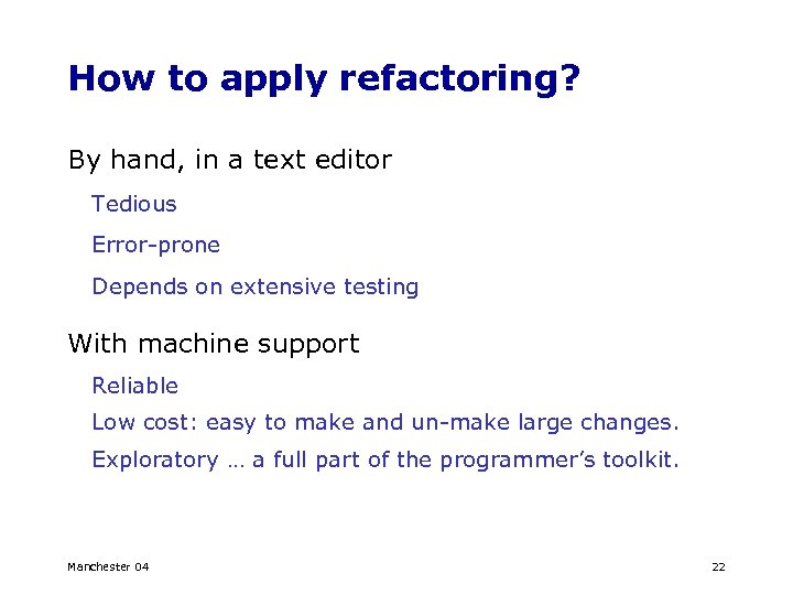 How to apply refactoring? By hand, in a text editor Tedious Error-prone Depends on extensive testing With machine support Reliable Low cost: easy to make and un-make large changes. Exploratory … a full part of the programmer’s toolkit. Manchester 04 22