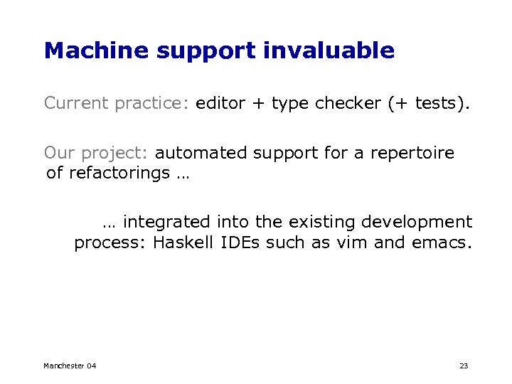 Machine support invaluable Current practice: editor + type checker (+ tests). Our project: automated support for a repertoire of refactorings … … integrated into the existing development process: Haskell IDEs such as vim and emacs. Manchester 04 23