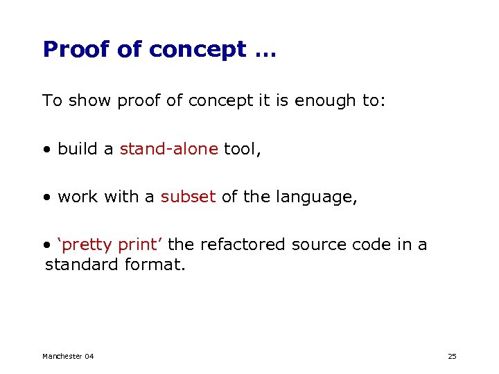 Proof of concept … To show proof of concept it is enough to: • build a stand-alone tool, • work with a subset of the language, • ‘pretty print’ the refactored source code in a standard format. Manchester 04 25