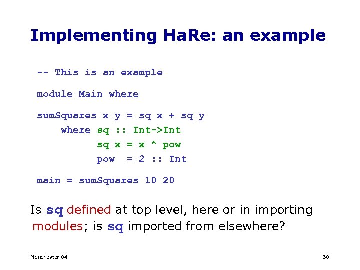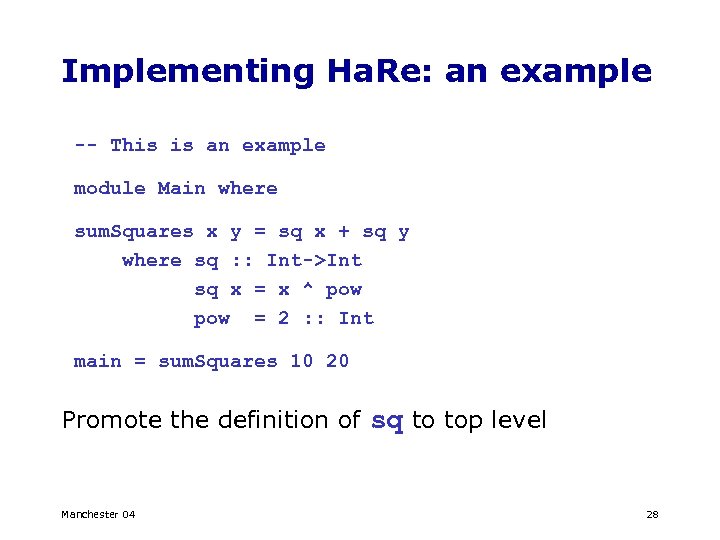Implementing Ha. Re: an example -- This is an example module Main where sum. Squares x y = sq x + sq y where sq : : Int->Int sq x = x ^ pow = 2 : : Int main = sum. Squares 10 20 Promote the definition of sq to top level Manchester 04 28