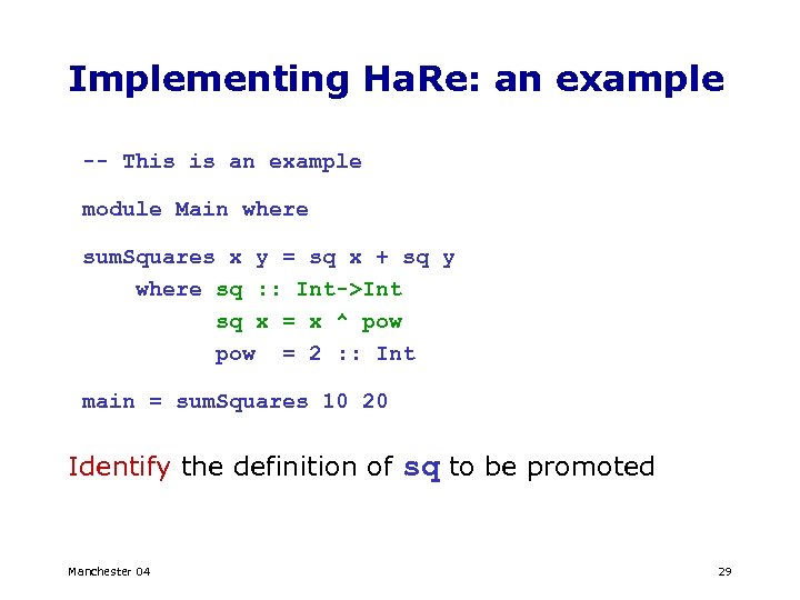 Implementing Ha. Re: an example -- This is an example module Main where sum. Squares x y = sq x + sq y where sq : : Int->Int sq x = x ^ pow = 2 : : Int main = sum. Squares 10 20 Identify the definition of sq to be promoted Manchester 04 29