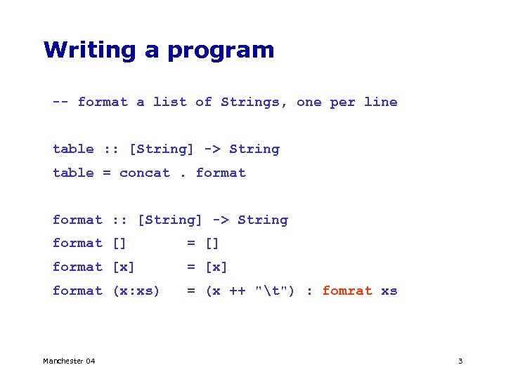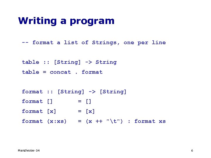 Writing a program -- format a list of Strings, one per line table : : [String] -> String table = concat. format : : [String] -> [String] format [] = [] format [x] = [x] format (x: xs) = (x ++ “t") : format xs Manchester 04 7