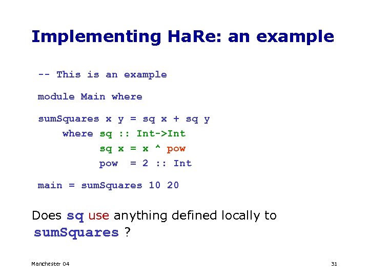 Implementing Ha. Re: an example -- This is an example module Main where sum. Squares x y = sq x + sq y where sq : : Int->Int sq x = x ^ pow = 2 : : Int main = sum. Squares 10 20 Does sq use anything defined locally to sum. Squares ? Manchester 04 31