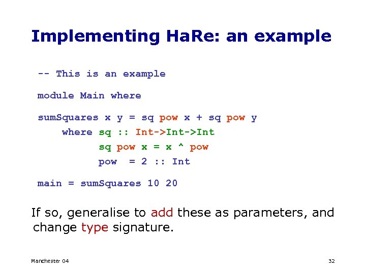 Implementing Ha. Re: an example -- This is an example module Main where sum. Squares x y = sq pow x + sq pow y where sq : : Int->Int sq pow x = x ^ pow = 2 : : Int main = sum. Squares 10 20 If so, generalise to add these as parameters, and change type signature. Manchester 04 32