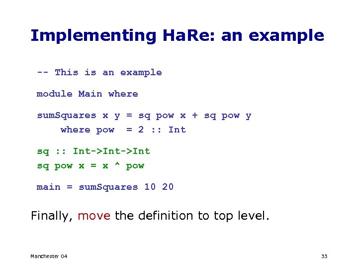 Implementing Ha. Re: an example -- This is an example module Main where sum. Squares x y = sq pow x + sq pow y where pow = 2 : : Int sq : : Int->Int sq pow x = x ^ pow main = sum. Squares 10 20 Finally, move the definition to top level. Manchester 04 33