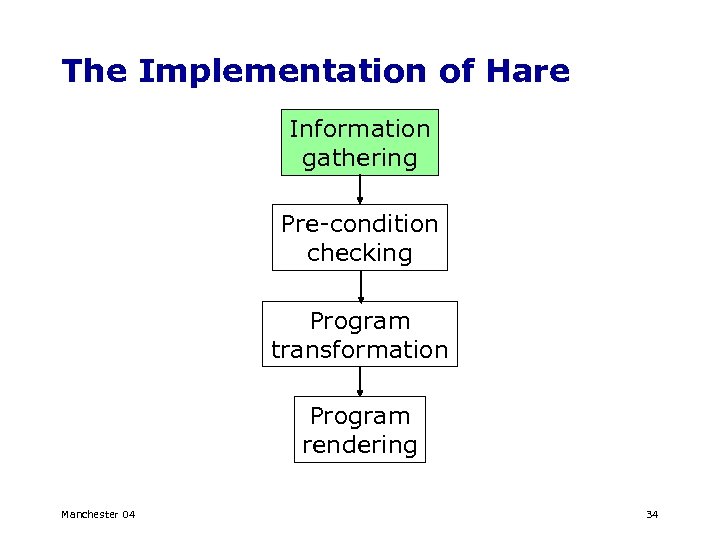 The Implementation of Hare Information gathering Pre-condition checking Program transformation Program rendering Manchester 04 34