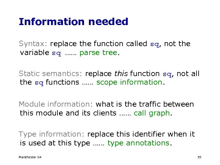 Information needed Syntax: replace the function called sq, not the variable sq …… parse tree. Static semantics: replace this function sq, not all the sq functions …… scope information. Module information: what is the traffic between this module and its clients …… call graph. Type information: replace this identifier when it is used at this type …… type annotations. Manchester 04 35