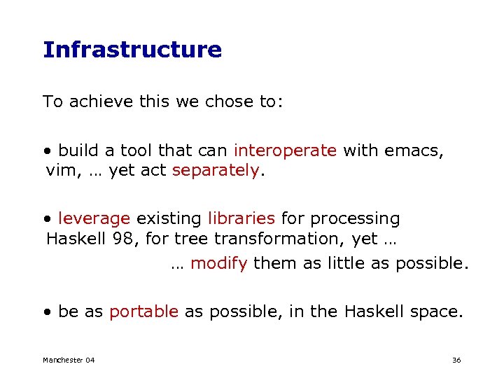 Infrastructure To achieve this we chose to: • build a tool that can interoperate with emacs, vim, … yet act separately. • leverage existing libraries for processing Haskell 98, for tree transformation, yet … … modify them as little as possible. • be as portable as possible, in the Haskell space. Manchester 04 36