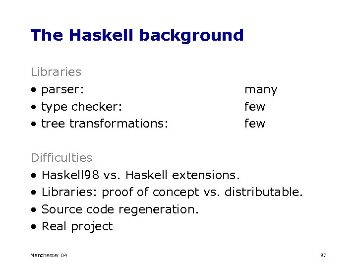 The Haskell background Libraries • parser: • type checker: • tree transformations: many few Difficulties • Haskell 98 vs. Haskell extensions. • Libraries: proof of concept vs. distributable. • Source code regeneration. • Real project Manchester 04 37