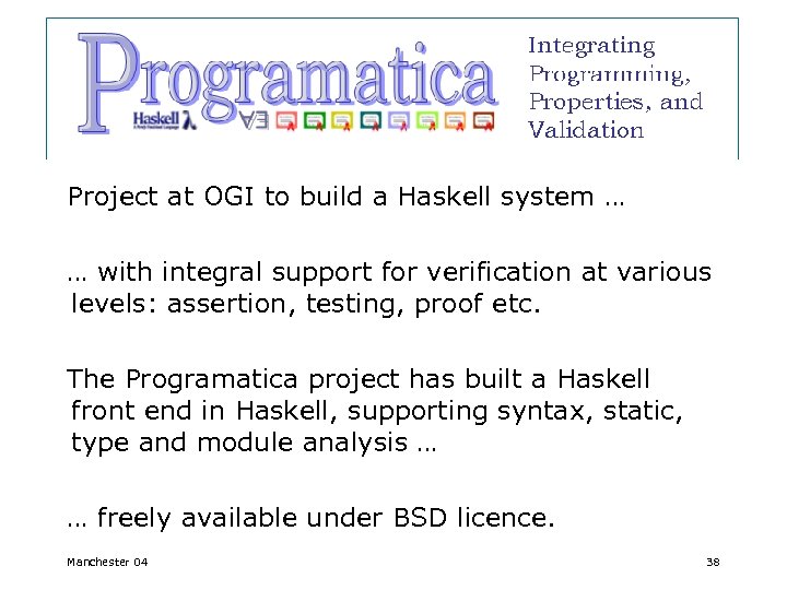 Programatica Project at OGI to build a Haskell system … … with integral support for verification at various levels: assertion, testing, proof etc. The Programatica project has built a Haskell front end in Haskell, supporting syntax, static, type and module analysis … … freely available under BSD licence. Manchester 04 38