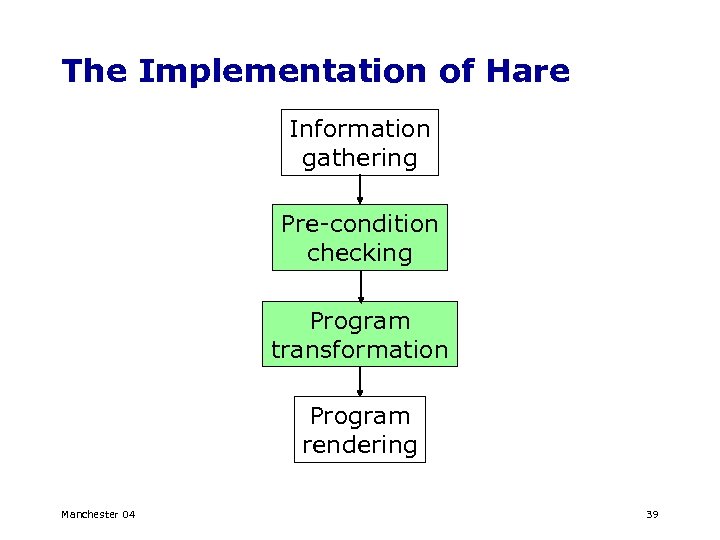 The Implementation of Hare Information gathering Pre-condition checking Program transformation Program rendering Manchester 04 39