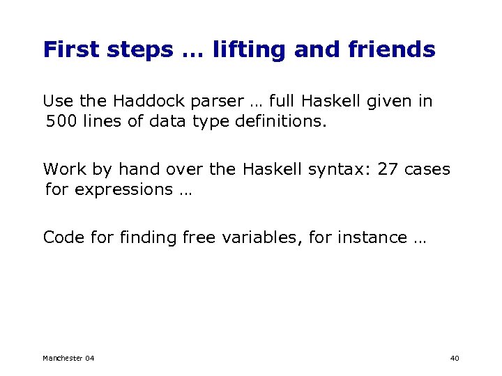 First steps … lifting and friends Use the Haddock parser … full Haskell given in 500 lines of data type definitions. Work by hand over the Haskell syntax: 27 cases for expressions … Code for finding free variables, for instance … Manchester 04 40