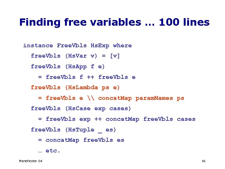 Finding free variables … 100 lines instance Free. Vbls Hs. Exp where free. Vbls (Hs. Var v) = [v] free. Vbls (Hs. App f e) = free. Vbls f ++ free. Vbls e free. Vbls (Hs. Lambda ps e) = free. Vbls e \ concat. Map param. Names ps free. Vbls (Hs. Case exp cases) = free. Vbls exp ++ concat. Map free. Vbls cases free. Vbls (Hs. Tuple _ es) = concat. Map free. Vbls es … etc. Manchester 04 41