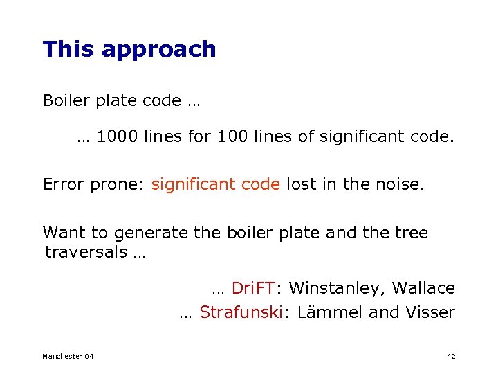 This approach Boiler plate code … … 1000 lines for 100 lines of significant code. Error prone: significant code lost in the noise. Want to generate the boiler plate and the tree traversals … … Dri. FT: Winstanley, Wallace … Strafunski: Lämmel and Visser Manchester 04 42