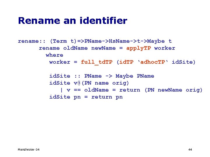 Rename an identifier rename: : (Term t)=>PName->Hs. Name->t->Maybe t rename old. Name new. Name = apply. TP worker where worker = full_td. TP (id. TP ‘adhoc. TP‘ id. Site) id. Site | v id. Site Manchester 04 : : PName -> Maybe PName v@(PN name orig) == old. Name = return (PN new. Name orig) pn = return pn 44