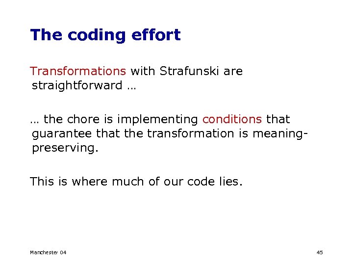 The coding effort Transformations with Strafunski are straightforward … … the chore is implementing conditions that guarantee that the transformation is meaningpreserving. This is where much of our code lies. Manchester 04 45