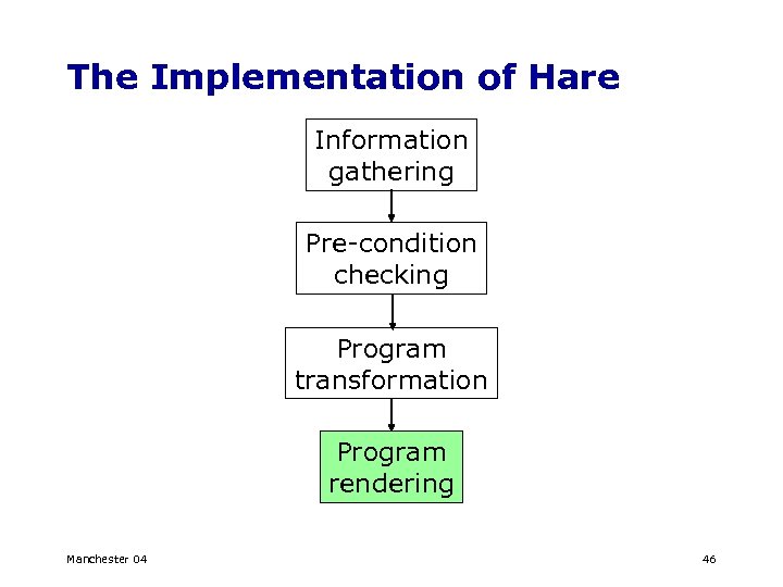 The Implementation of Hare Information gathering Pre-condition checking Program transformation Program rendering Manchester 04 46
