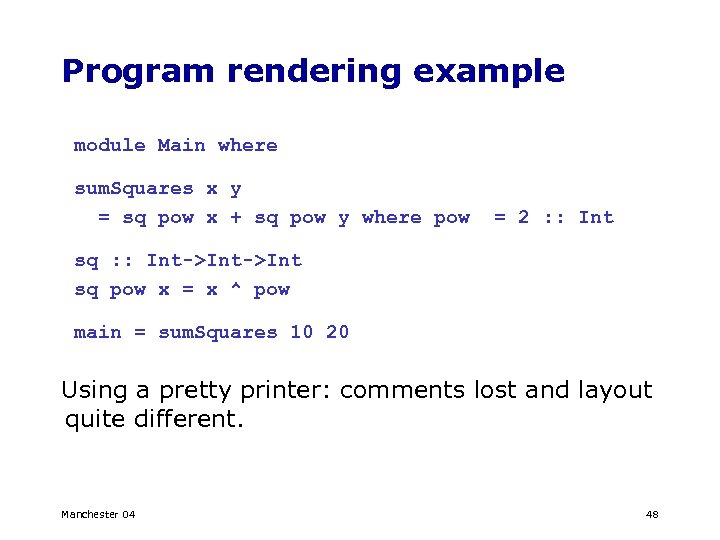 Program rendering example module Main where sum. Squares x y = sq pow x + sq pow y where pow = 2 : : Int sq : : Int->Int sq pow x = x ^ pow main = sum. Squares 10 20 Using a pretty printer: comments lost and layout quite different. Manchester 04 48