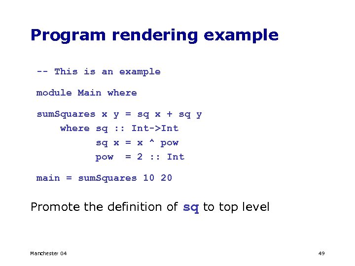 Program rendering example -- This is an example module Main where sum. Squares x y = sq x + sq y where sq : : Int->Int sq x = x ^ pow = 2 : : Int main = sum. Squares 10 20 Promote the definition of sq to top level Manchester 04 49