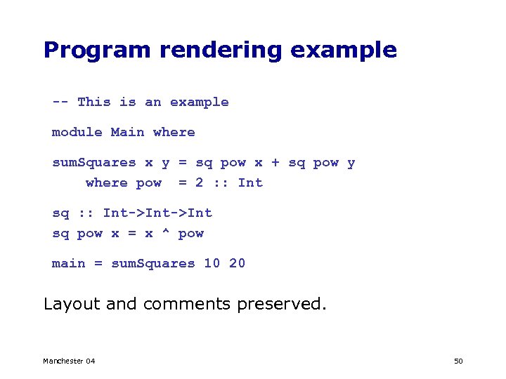 Program rendering example -- This is an example module Main where sum. Squares x y = sq pow x + sq pow y where pow = 2 : : Int sq : : Int->Int sq pow x = x ^ pow main = sum. Squares 10 20 Layout and comments preserved. Manchester 04 50
