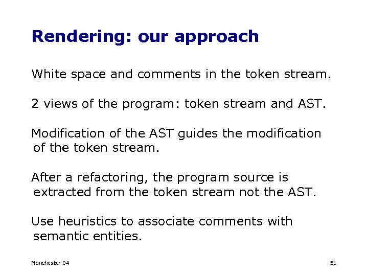 Rendering: our approach White space and comments in the token stream. 2 views of the program: token stream and AST. Modification of the AST guides the modification of the token stream. After a refactoring, the program source is extracted from the token stream not the AST. Use heuristics to associate comments with semantic entities. Manchester 04 51
