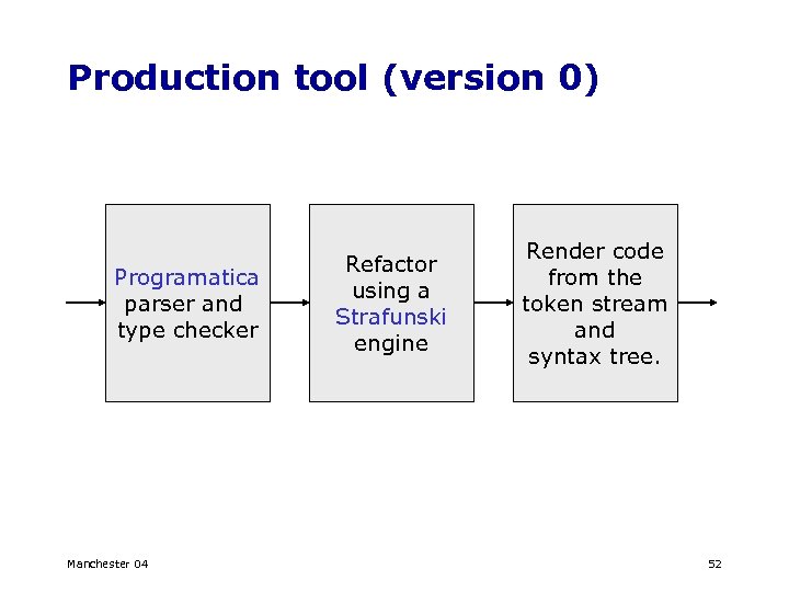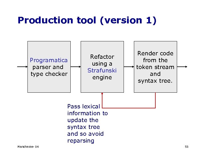 Production tool (version 1) Programatica parser and type checker Refactor using a Strafunski engine Render code from the token stream and syntax tree. Pass lexical information to update the syntax tree and so avoid reparsing Manchester 04 53