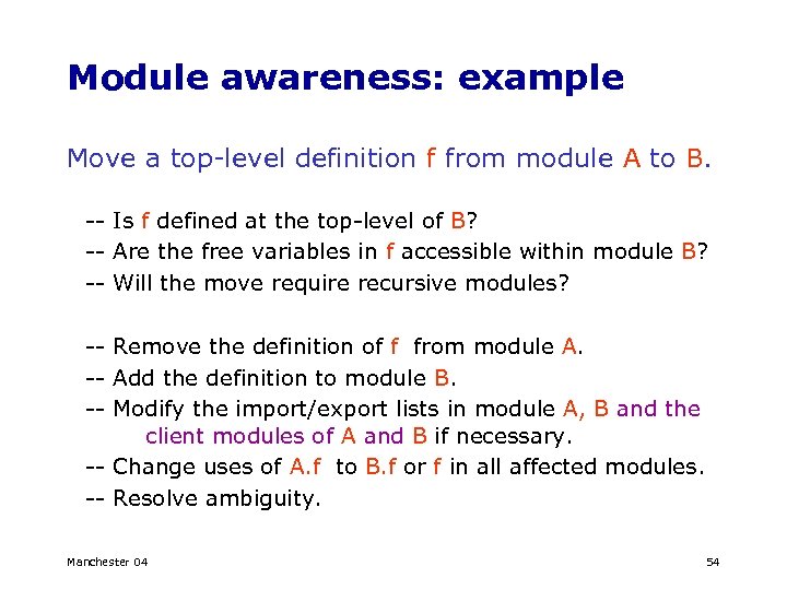 Module awareness: example Move a top-level definition f from module A to B. -- Is f defined at the top-level of B? -- Are the free variables in f accessible within module B? -- Will the move require recursive modules? -- Remove the definition of f from module A. -- Add the definition to module B. -- Modify the import/export lists in module A, B and the client modules of A and B if necessary. -- Change uses of A. f to B. f or f in all affected modules. -- Resolve ambiguity. Manchester 04 54