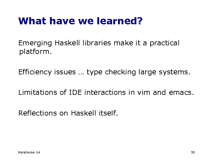 What have we learned? Emerging Haskell libraries make it a practical platform. Efficiency issues … type checking large systems. Limitations of IDE interactions in vim and emacs. Reflections on Haskell itself. Manchester 04 55