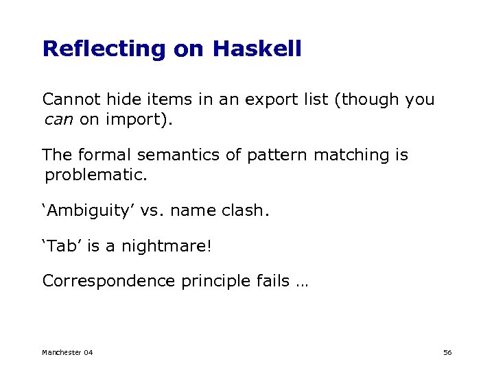Reflecting on Haskell Cannot hide items in an export list (though you can on import). The formal semantics of pattern matching is problematic. ‘Ambiguity’ vs. name clash. ‘Tab’ is a nightmare! Correspondence principle fails … Manchester 04 56