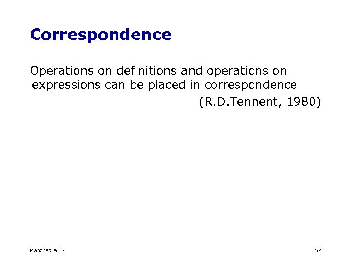 Correspondence Operations on definitions and operations on expressions can be placed in correspondence (R. D. Tennent, 1980) Manchester 04 57
