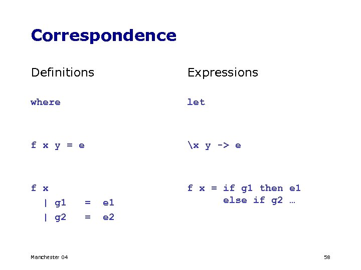 Correspondence Definitions Expressions where let f x y = e x y -> e f x | g 1 | g 2 f x = if g 1 then e 1 else if g 2 … Manchester 04 = = e 1 e 2 58