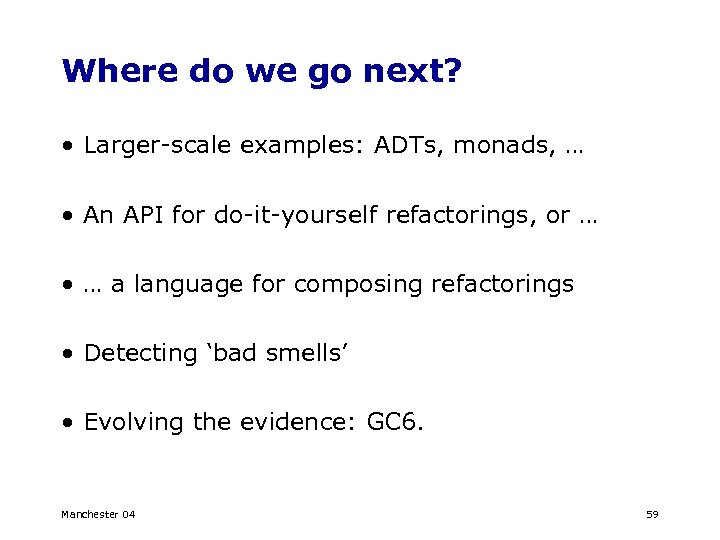 Where do we go next? • Larger-scale examples: ADTs, monads, … • An API for do-it-yourself refactorings, or … • … a language for composing refactorings • Detecting ‘bad smells’ • Evolving the evidence: GC 6. Manchester 04 59