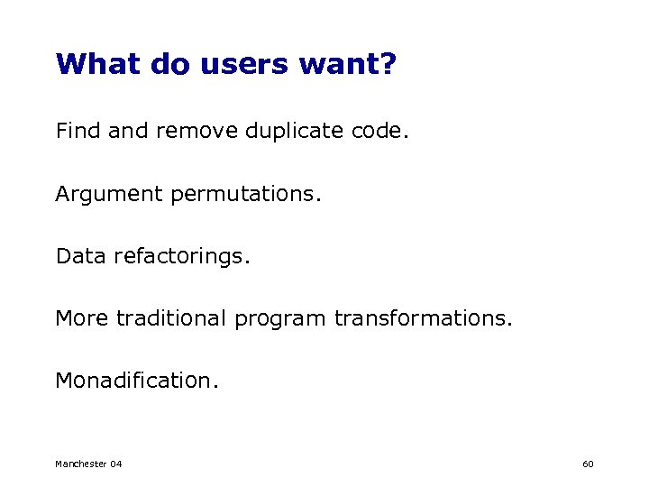 What do users want? Find and remove duplicate code. Argument permutations. Data refactorings. More traditional program transformations. Monadification. Manchester 04 60