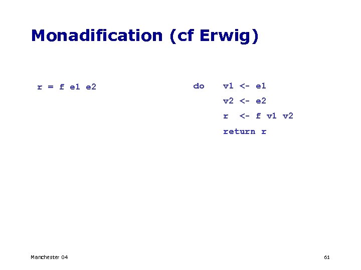 Monadification (cf Erwig) r = f e 1 e 2 do v 1 <- e 1 v 2 <- e 2 r <- f v 1 v 2 return r Manchester 04 61