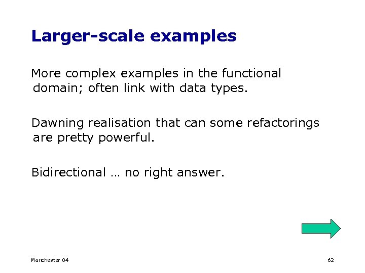 Larger-scale examples More complex examples in the functional domain; often link with data types. Dawning realisation that can some refactorings are pretty powerful. Bidirectional … no right answer. Manchester 04 62