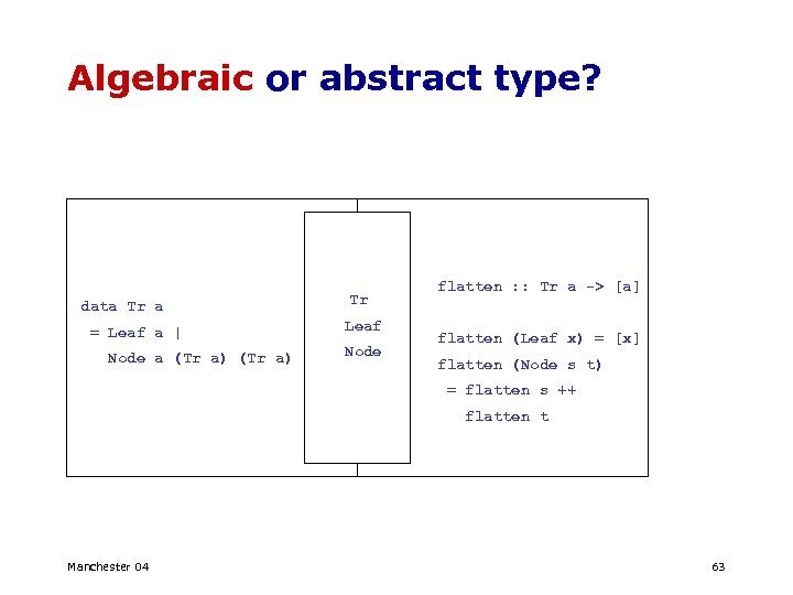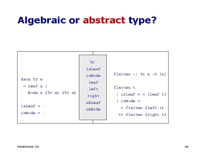 Algebraic or abstract type? Tr is. Leaf data Tr a = Leaf a | Node a (Tr a) is. Leaf = … is. Node flatten : : Tr a -> [a] leaf left right mk. Leaf mk. Node flatten t | isleaf t = [leaf t] | is. Node t = flatten (left t) ++ flatten (right t) … Manchester 04 64