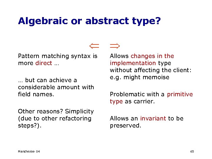 Algebraic or abstract type? Pattern matching syntax is more direct … … but can achieve a considerable amount with field names. Other reasons? Simplicity (due to other refactoring steps? ). Manchester 04 Allows changes in the implementation type without affecting the client: e. g. might memoise Problematic with a primitive type as carrier. Allows an invariant to be preserved. 65