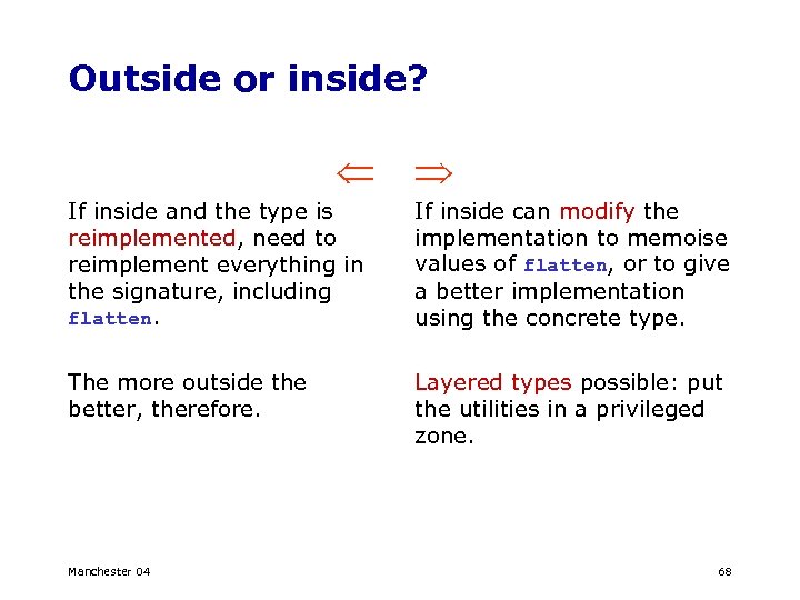 Outside or inside? If inside and the type is reimplemented, need to reimplement everything in the signature, including flatten. If inside can modify the implementation to memoise values of flatten, or to give a better implementation using the concrete type. The more outside the better, therefore. Layered types possible: put the utilities in a privileged zone. Manchester 04 68