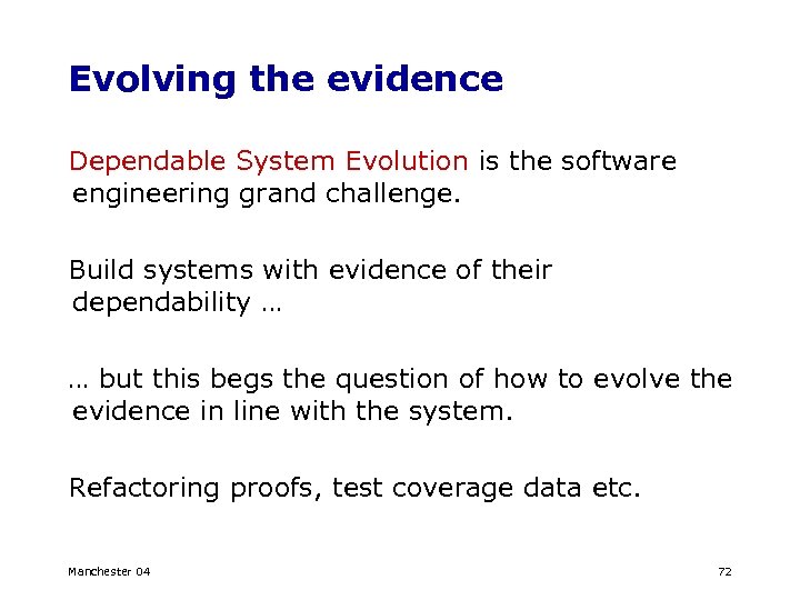 Evolving the evidence Dependable System Evolution is the software engineering grand challenge. Build systems with evidence of their dependability … … but this begs the question of how to evolve the evidence in line with the system. Refactoring proofs, test coverage data etc. Manchester 04 72