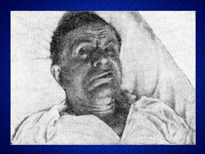 Клинические проявления • Продолжительность инкубационного периода составляет от 1 до 30 сут, обычно 6– 14 сут. • Продромальные явления. • Первым имеющим большое диагностическое значение симптомом является тризм. • Затем повышение мышечного тонуса распространяется на мимические мышцы, черты лица искажаются, придавая лицу своеобразное выражение иронической улыбки или плача ( «сардоническая улыбка» ). • Гипертонус глотательной мускулатуры приводит к затруднению акта глотания, развивается дисфагия.