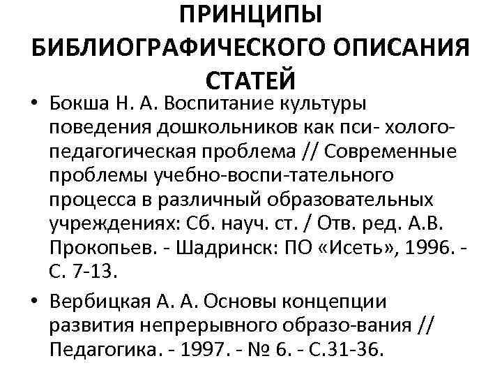 ПРИНЦИПЫ БИБЛИОГРАФИЧЕСКОГО ОПИСАНИЯ СТАТЕЙ • Бокша Н. А. Воспитание культуры поведения дошкольников как пси холого педагогическая проблема // Современные проблемы учебно воспи тательного процесса в различный образовательных учреждениях: Сб. науч. ст. / Отв. ред. А. В. Прокопьев. Шадринск: ПО «Исеть» , 1996. С. 7 13. • Вербицкая А. А. Основы концепции развития непрерывного образо вания // Педагогика. 1997. № 6. С. 31 36.