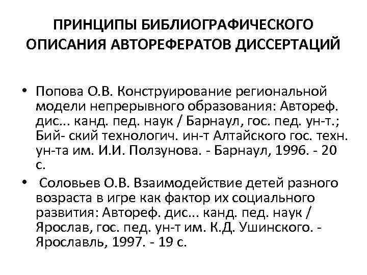 ПРИНЦИПЫ БИБЛИОГРАФИЧЕСКОГО ОПИСАНИЯ АВТОРЕФЕРАТОВ ДИССЕРТАЦИЙ • Попова О. В. Конструирование региональной модели непрерывного образования: Автореф. дис. . . канд. пед. наук / Барнаул, гос. пед. ун т. ; Бий ский технологич. ин т Алтайского гос. техн. ун та им. И. И. Ползунова. Барнаул, 1996. 20 с. • Соловьев О. В. Взаимодействие детей разного возраста в игре как фактор их социального развития: Автореф. дис. . . канд. пед. наук / Ярослав, гос. пед. ун т им. К. Д. Ушинского. Ярославль, 1997. 19 с.