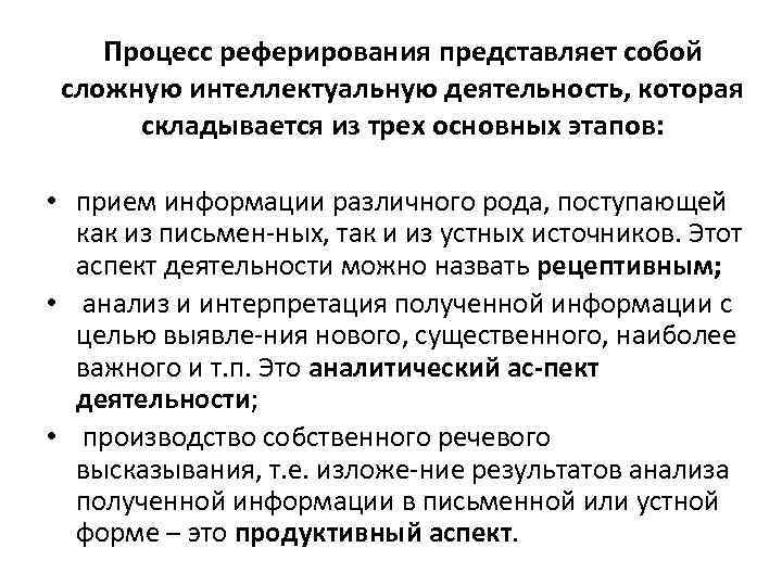 Процесс реферирования представляет собой сложную интеллектуальную деятельность, которая складывается из трех основных этапов: • прием информации различного рода, поступающей как из письмен ных, так и из устных источников. Этот аспект деятельности можно назвать рецептивным; • анализ и интерпретация полученной информации с целью выявле ния нового, существенного, наиболее важного и т. п. Это аналитический ас пект деятельности; • производство собственного речевого высказывания, т. е. изложе ние результатов анализа полученной информации в письменной или устной форме – это продуктивный аспект.